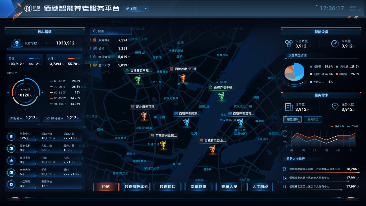 全面集成了長者、智能設(shè)備、服務(wù)需求等各類信息,不僅能展示長者總數(shù)、性別年齡分布、失能及認(rèn)知障礙等特殊老人數(shù)量,還涵蓋服務(wù)中心、機(jī)構(gòu)等養(yǎng)老設(shè)施相關(guān)數(shù)據(jù)。通過地圖標(biāo)記、餅圖、折線圖等可視化方式,將復(fù)雜數(shù)據(jù)直觀呈現(xiàn),同時精準(zhǔn)統(tǒng)計設(shè)備數(shù)量、采集量、訂單數(shù)等,支持按時間篩選。