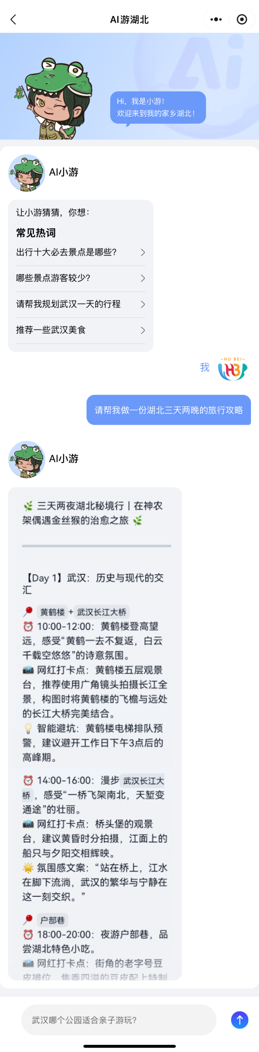 近日,數(shù)旅集團(tuán)游湖北平臺正式上線“AI游湖北”板塊,無論是行程規(guī)劃、景點(diǎn)介紹,還是實(shí)時(shí)天氣查詢、景區(qū)客流預(yù)警,都能輕松實(shí)現(xiàn)。為游客提供更加全面、便捷、智能的旅游服務(wù),進(jìn)一步推動數(shù)旅集團(tuán)在文旅領(lǐng)域的創(chuàng)新發(fā)展。