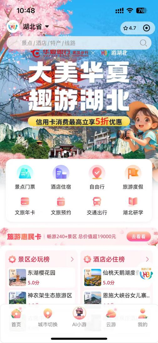 在數(shù)字化消費(fèi)場(chǎng)景深度融合的背景下,雙方構(gòu)建“三重惠民”服務(wù)體系:一是消費(fèi)立減,用戶通過“游湖北”微信小程序預(yù)訂景區(qū)門票、精品酒店、特色年卡及品質(zhì)跟團(tuán)游產(chǎn)品時(shí),使用微信支付(綁定華夏銀行信用卡),可享最高5折優(yōu)惠,單筆立減50元封頂;二是場(chǎng)景互通,整合省內(nèi)熱門景區(qū)、優(yōu)質(zhì)酒店資源形成消費(fèi)矩陣;三是長(zhǎng)效賦能,通過“月月享優(yōu)惠”機(jī)制(每自然月限享1次)持續(xù)激發(fā)消費(fèi)活力。